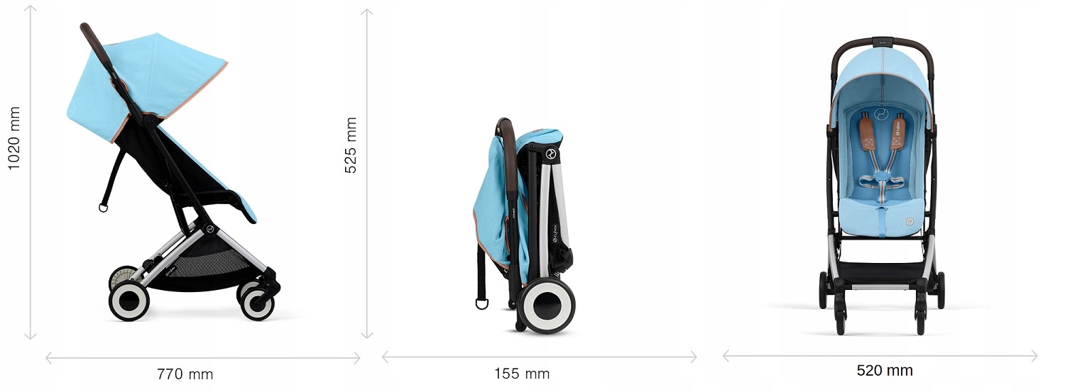 Последний Версия Cybex Orfeo имеет регулируемые ремни для ребенка, как в автомобильном сиденье. Он сочетает в себе особенности удобной коляски с типичной городской коляской. Его размеры после складывания и веса позволяют транспортировать в качестве ручного багажа на самолете. Его складывание и развертывание невероятно просты, и это сделано одной рукой. После складывания, благодаря плечевому ремню, его можно перемещать как спортивная сумка. Секунды за несколько секунд рука на удобном ремепе
