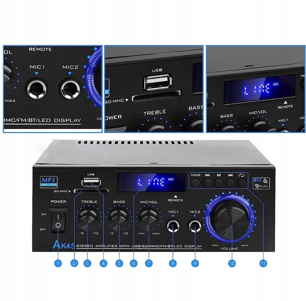 - Этот домашний усилитель мощности звука с Bluetooth, AUX, MIC, SD, USB, аудиовходом от внешних устройств, такие как CD, DVD, телевизор, ПК, компьютеры, планшеты, ноутбуки, телефоны, MP3 и проекторы с AV-аудио и т. д.