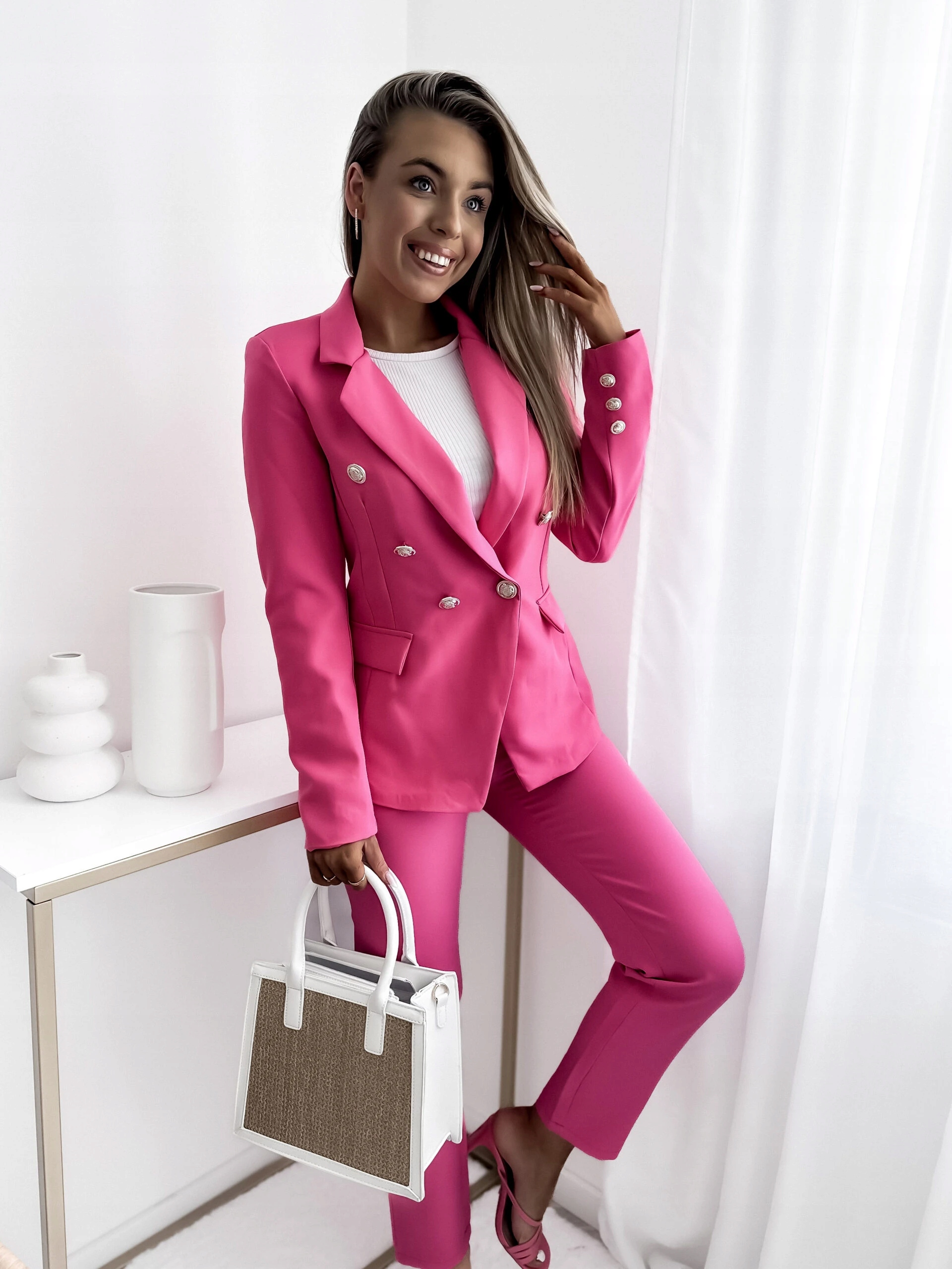 Выберите наш двойной костюм с кнопками и сигарильфом в Фуксии - выражение вашего уникального стиля сегодня!