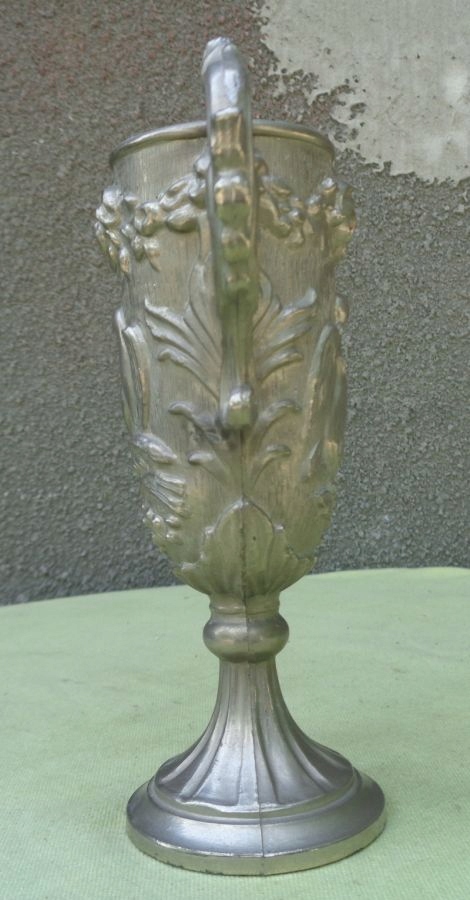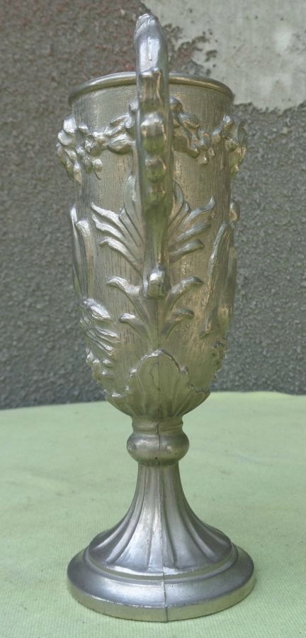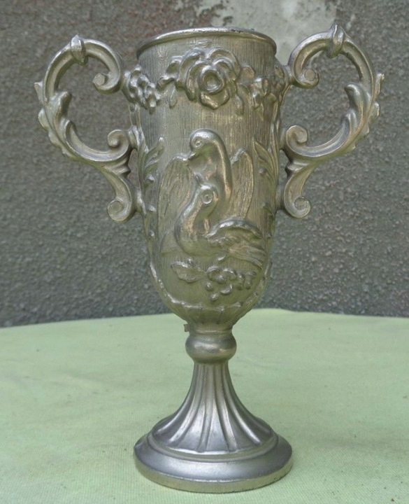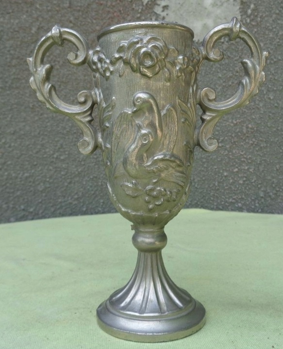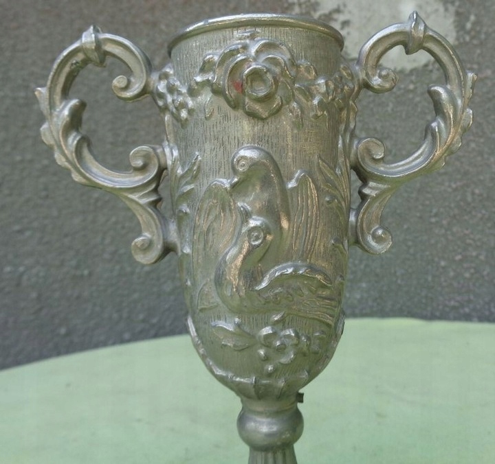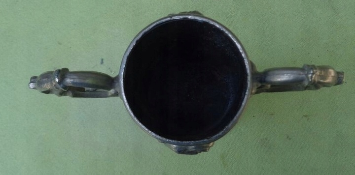 Интересная, богато декорированная двуручная чашка из олова. Основание экспоната плоское и сужается к верху. Он был украшен интересными орнаментами. Балдахин с обеих сторон украшен богатым натуралистическим орнаментом в виде цветочных венков и пар голубей. Чашка имеет богато декорированные ручки с обеих сторон. Всем рекомендую этот интересный экспонат.