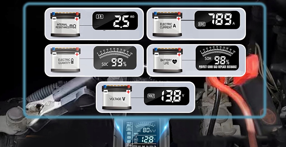 🚙 В то же время он использует передовую технологию тестирования проводимости, которая может отображаться на ЖК-экране всего за 3 секунды для отображения точных данных о состоянии батареи.