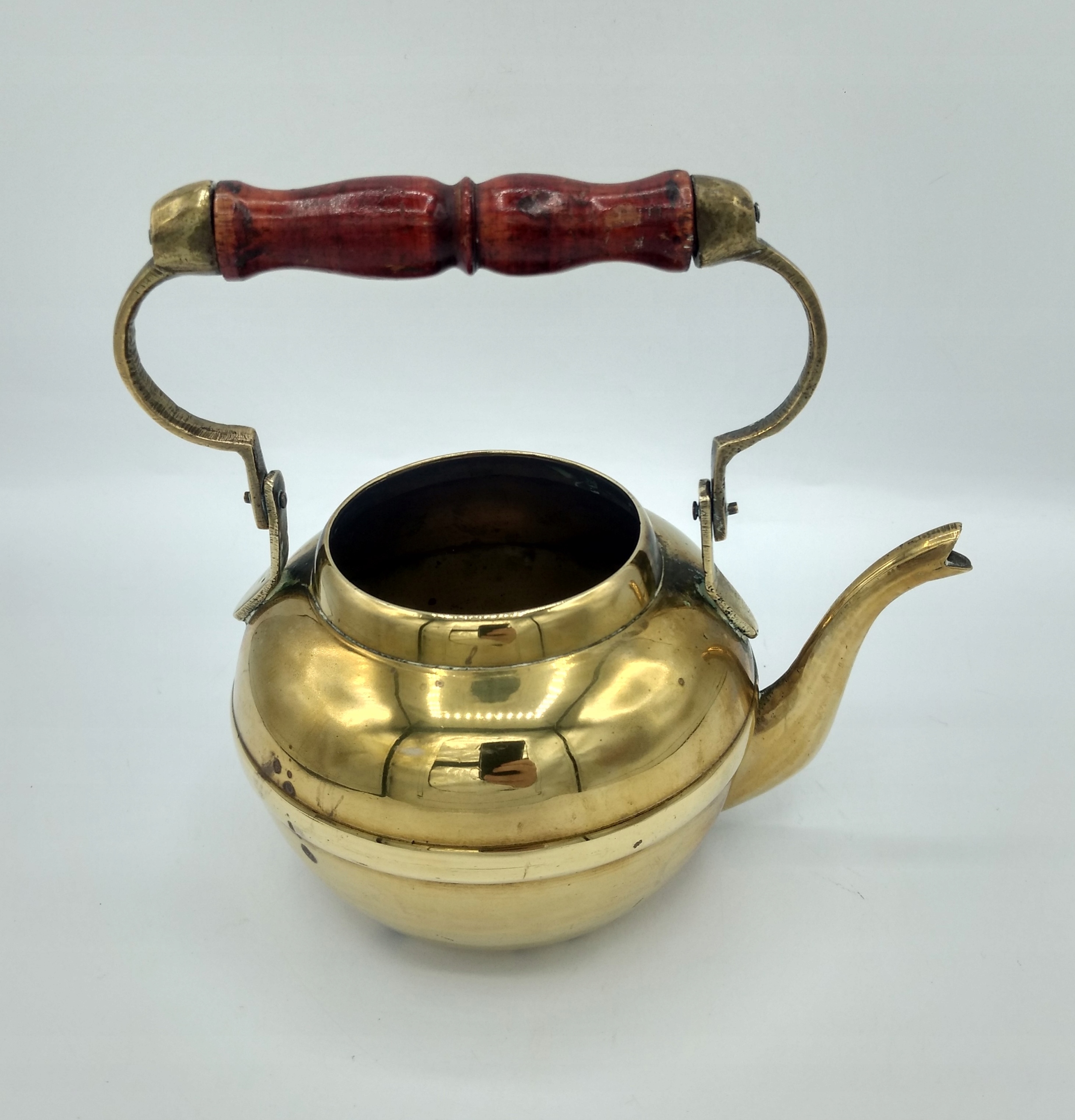 Изготовлено из латуни, ручная работа. , пайка, ручка подвижная, ручка деревянная. Тяжелый весит примерно 370 г. Емкость около 0,5л. Размеры: высота с ручкой 16 см, без ручки 10 см, диаметр отверстия 6,4 см, диаметр в центре около 11 см, длина с носиком 15,5 см. Чайник добротный, но это скорее украшение! Вода так медленно течёт через носик, что-то забивается :-(. Его всегда можно использовать как красивое украшение, цветочный горшок, контейнер для разных вещей и т.п. ..