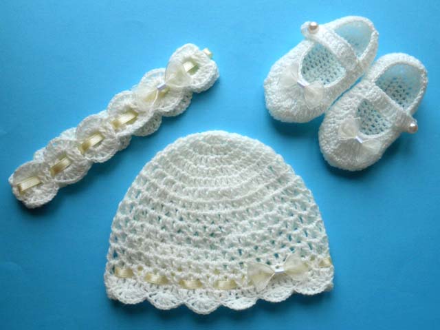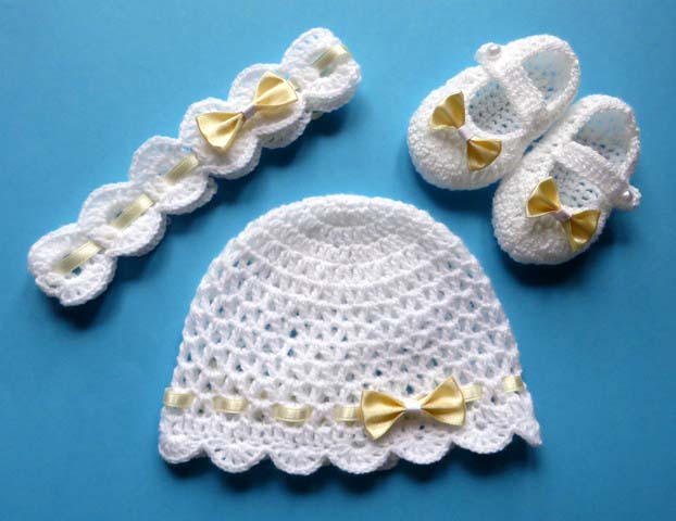 Комплект крючком из трех частей: шапка + туфли + повязка на голову могут быть выполнены из пряжи любого цвета, а фурнитура – с атласными (атласными) или шифоновыми (тюль) бантиками.