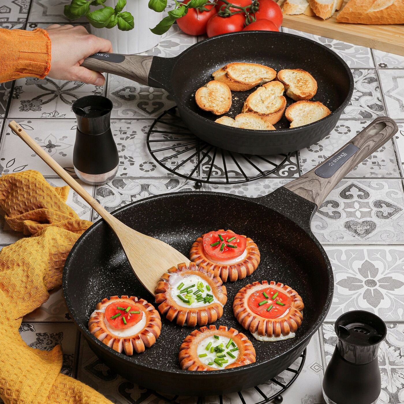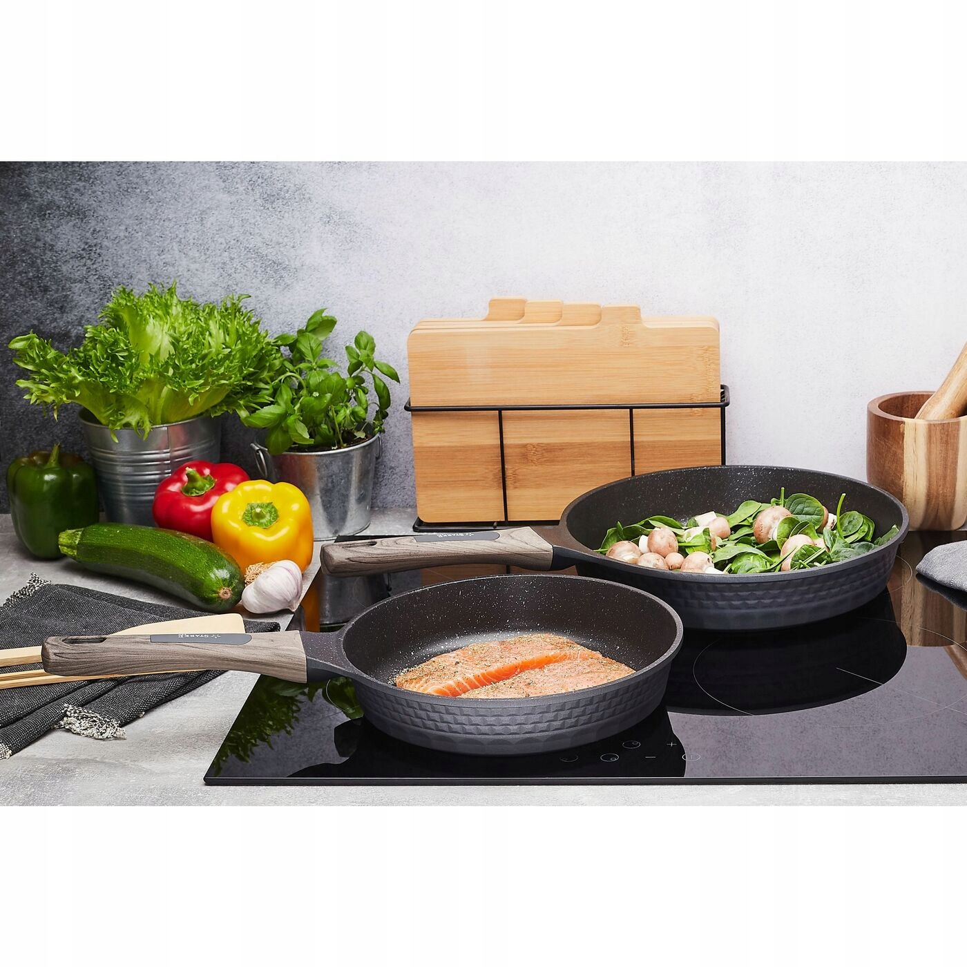 Индукционная сковорода Starke Pro с тиснением под мрамор диаметром 24 см изготовлена из алюминия. Для его создания использовалась технология гомогенного литья под давлением. Благодаря этому он идеально сбалансирован и очень прочен с точки зрения механических и термических свойств. Толщина стенок также обеспечивает повышенную долговечность. Внутренняя часть сковороды отделана каменным покрытием GREBLON C3+ с придающим жесткость керамическим слоем с гранитными частицами. Его высокое качество, отличная адгезия, твердость и трехслойная структура разработаны немецкой компанией WEILBURGER. Он также имеет маркировку PFOA Free. Энергоэффективность обеспечивается индукционным дном толщиной 5 мм. Благодаря этому вы можете использовать алюминиевую сковороду с тиснением размером 24 х 5,5 см на любой плите. Антипригарное покрытие также позволяет жарить с небольшим количеством жира и упрощает уход. Она выдерживает до 20 000 циклов истирания, что в десять раз больше, чем у обычных сковородок с антипригарным покрытием, имеющихся на рынке. Переносить и использовать модель облегчает ручка Soft Touch, которая не нагревается и не выскальзывает из руки. Его внешний вид стилизован под дерево. С его помощью вы укомплектуете свой собственный набор кухонной утвари. Для домашнего использования его рекомендовал Петр Кухарский, лично проверивший его возможности и качество. Гарантия на продукцию 5 лет!