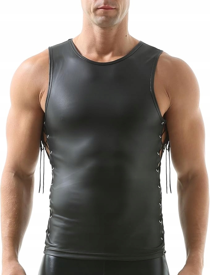 Czarny męski a'la skórzany lateksowy komplet bokserki koszulka sznurowany L