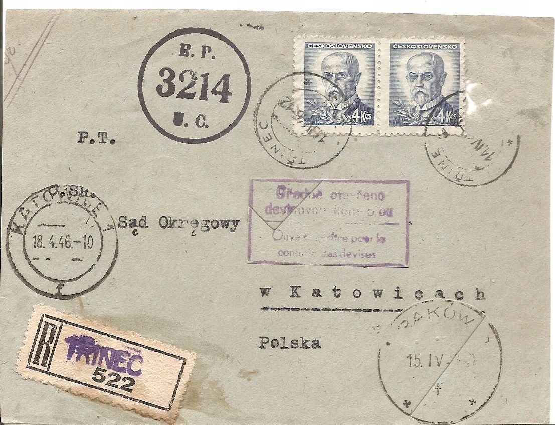 CZECHOSŁOWACJA -TRZYNIEC -przód koperty -obieg 1946 rok -stemple erka
