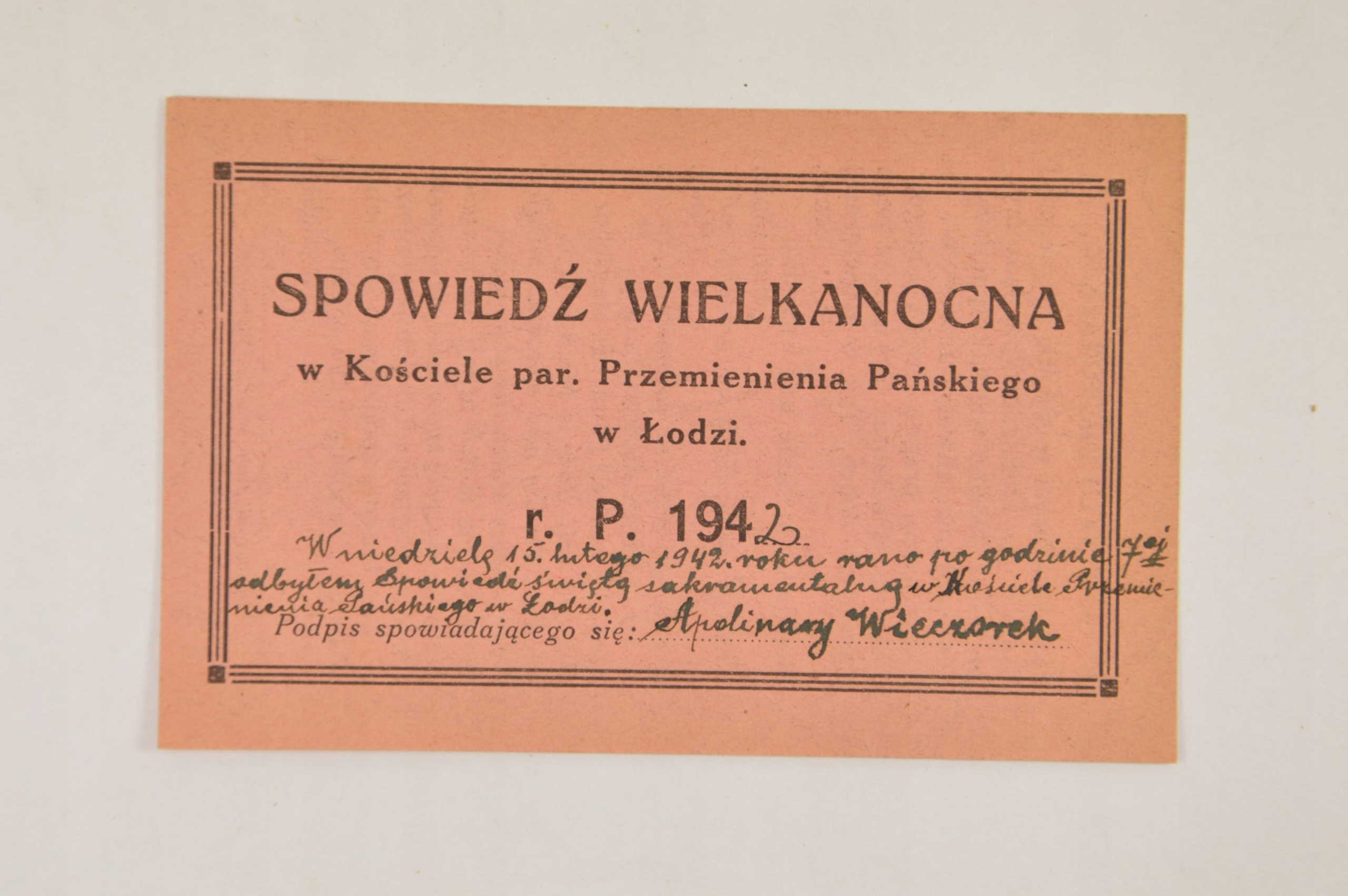 ŁÓDŹ KARTKA DO SPOWIEDZI 1942 r. KOŚCIÓŁ PRZEMIENIENIA PAŃSKIEGO