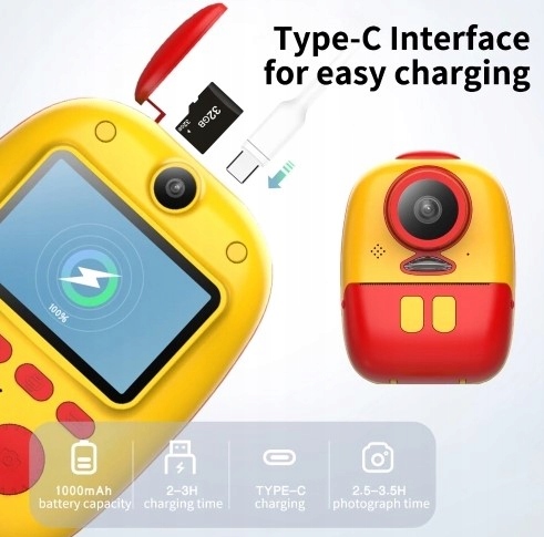 Легкая зарядка и расширение емкости: Благодаря удобной и сменной конструкции TF-карты просто замените TF-карту, чтобы расширить объем памяти. вместительная камера. Интерфейс Type-C гарантирует, что камеру можно будет зарядить в любое время, продлевая счастливое время для детей.