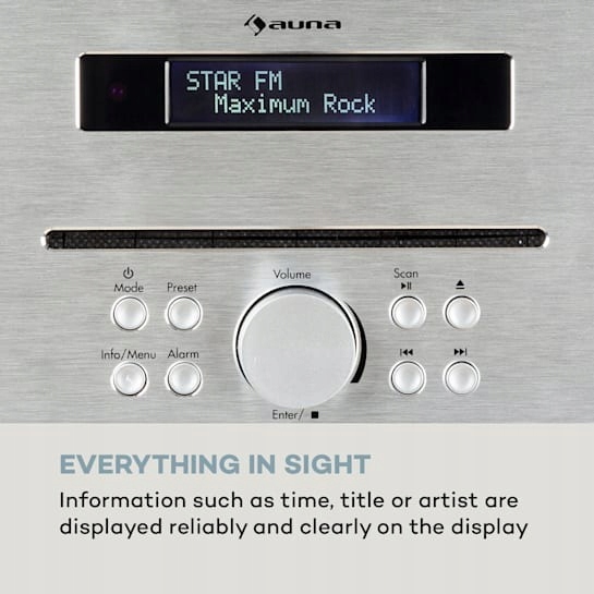 Проигрыватель компакт-дисков auna Silver Star CD-DAB представляет собой многофункциональное устройство воспроизведения. Помимо функции проигрывателя компакт-дисков, он также принимает DAB+ и FM-радио.