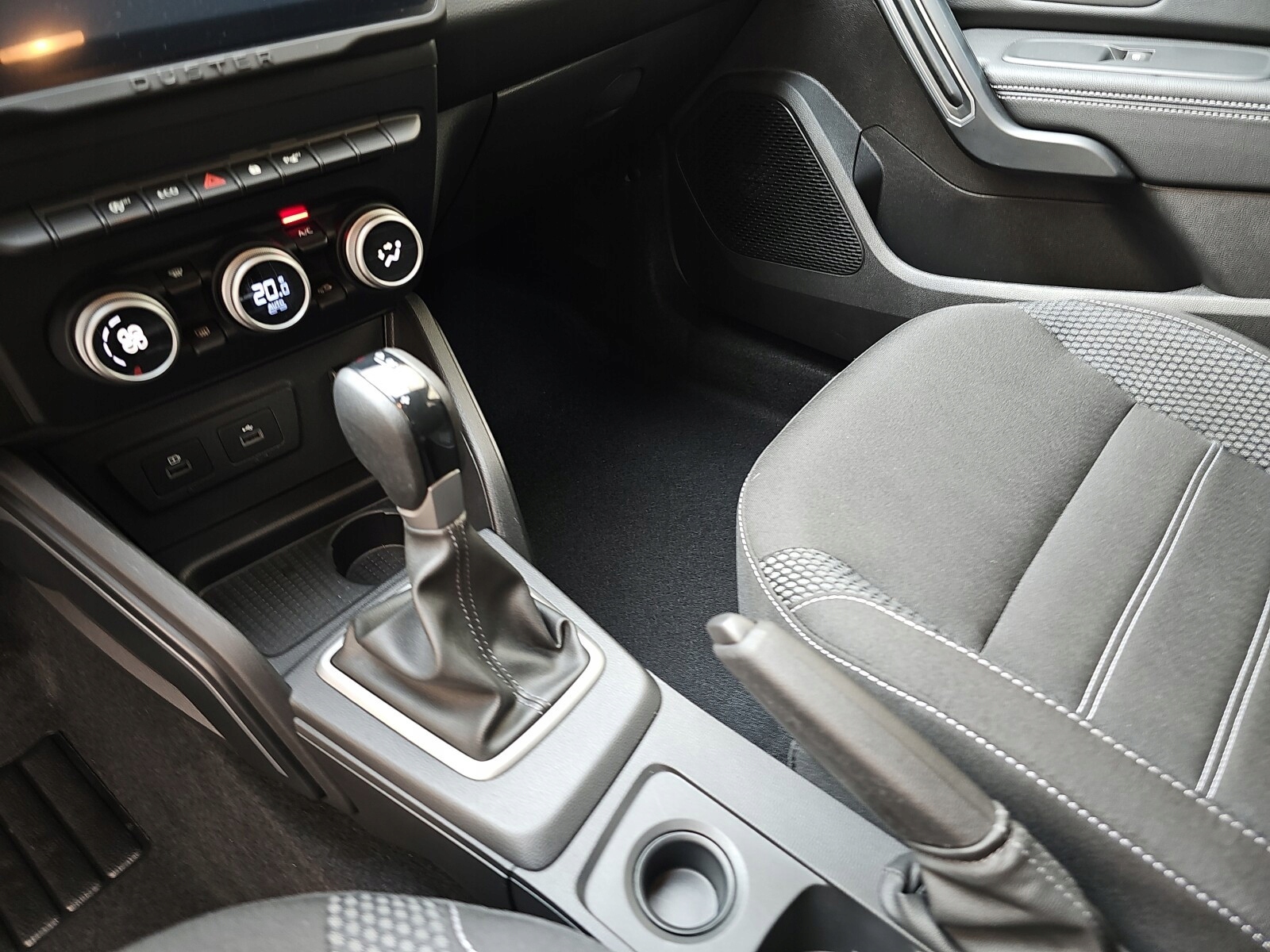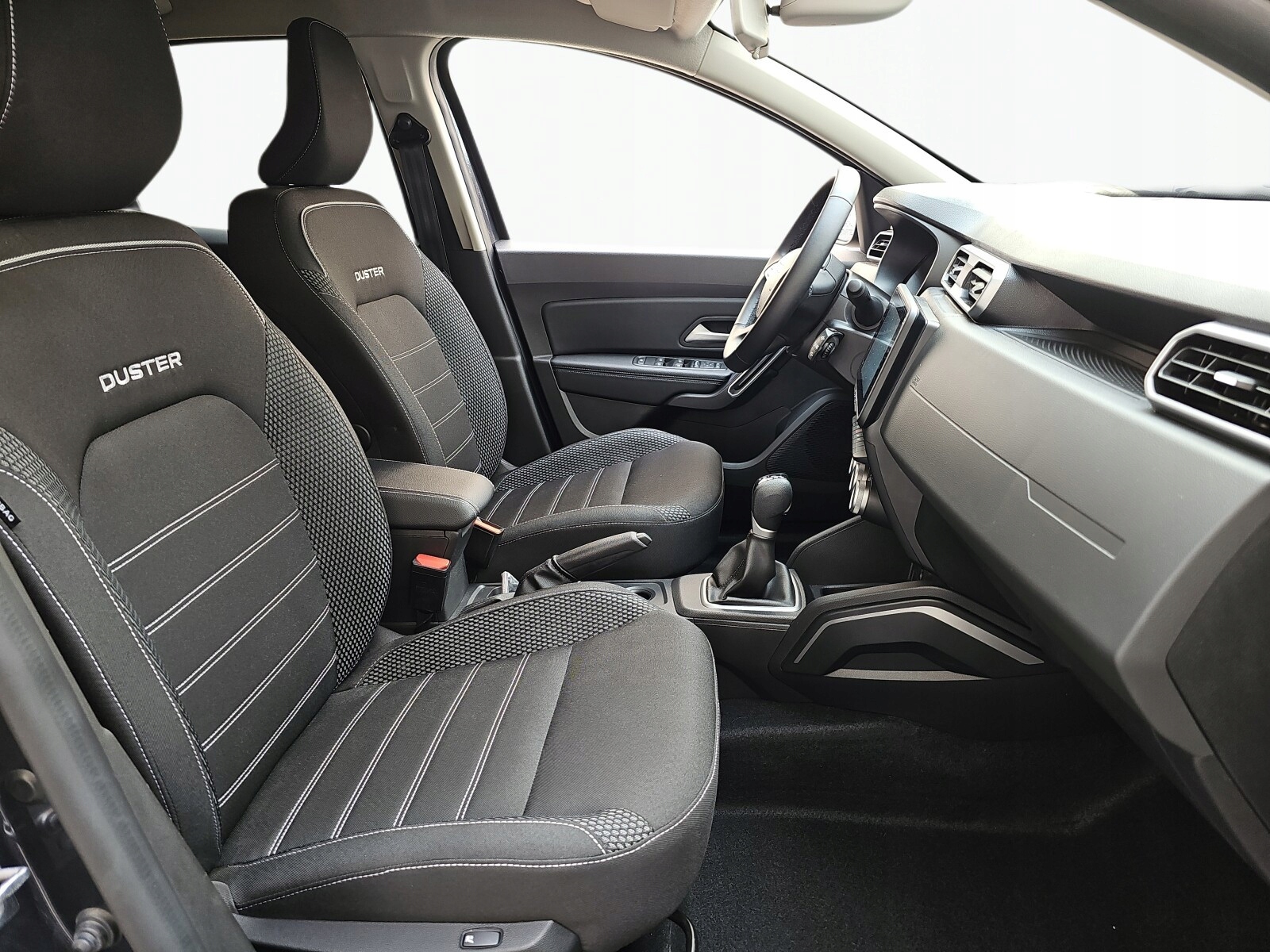 Черный материал обивка с белой строчкой и логотипом Duster