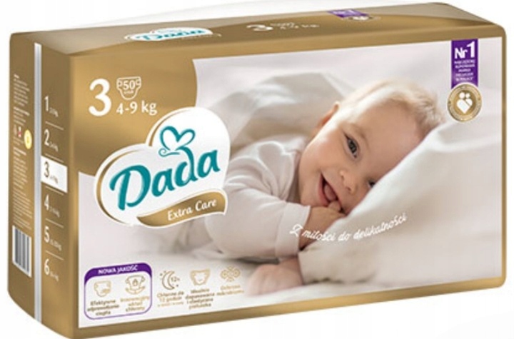 DADA Extra Care 3 MIDI-подгузники предназначены для детей с 4-9 кг > Использование инновационной второй технологии означает, что подгузники на 2 X более сухие. Благодаря этому подгузник сразу становится сухим, что оказывает положительное влияние на состояние кожи ребенка. Предыдущий вариант DADA Extra Care). Новая структура подгузников немедленно переносит влагу во внутреннюю часть подгузника, где происходит длительное поглощение влаги. Благодаря этому подгузник немедленно высыхает, что оказывает положительное влияние на состояние кожи ребенка. Новое покрытие подгузников еще более мягкое и нежнее даже для самой чувствительной кожи. Гибкие стороны гарантируют ребенку свободу передвижения, а специальные плоские резиновые полосы угнетают 4 х легче на коже ребенка, чем стандартные круглые резины