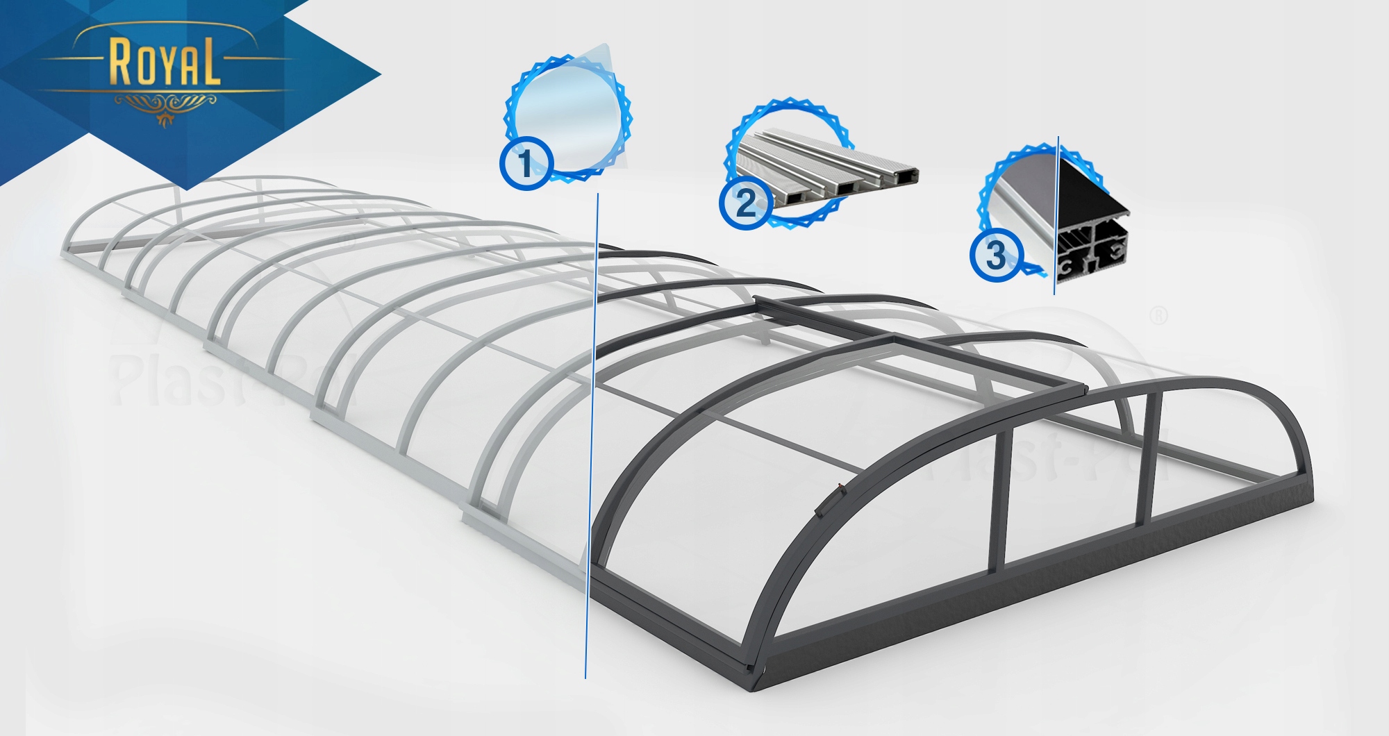 Королевские крыши отличаются особенно роскошным дизайном и качеством изготовления. Их низкая и аэродинамическая форма обеспечивает очень хорошую устойчивость к погодным условиям и ветру. Крыша бассейна «Роял» также является отличным решением для людей, которые ценят современный вид сада, а ее низкий профиль эффектно впишется в любой дизайн, не нарушая природный ландшафт.