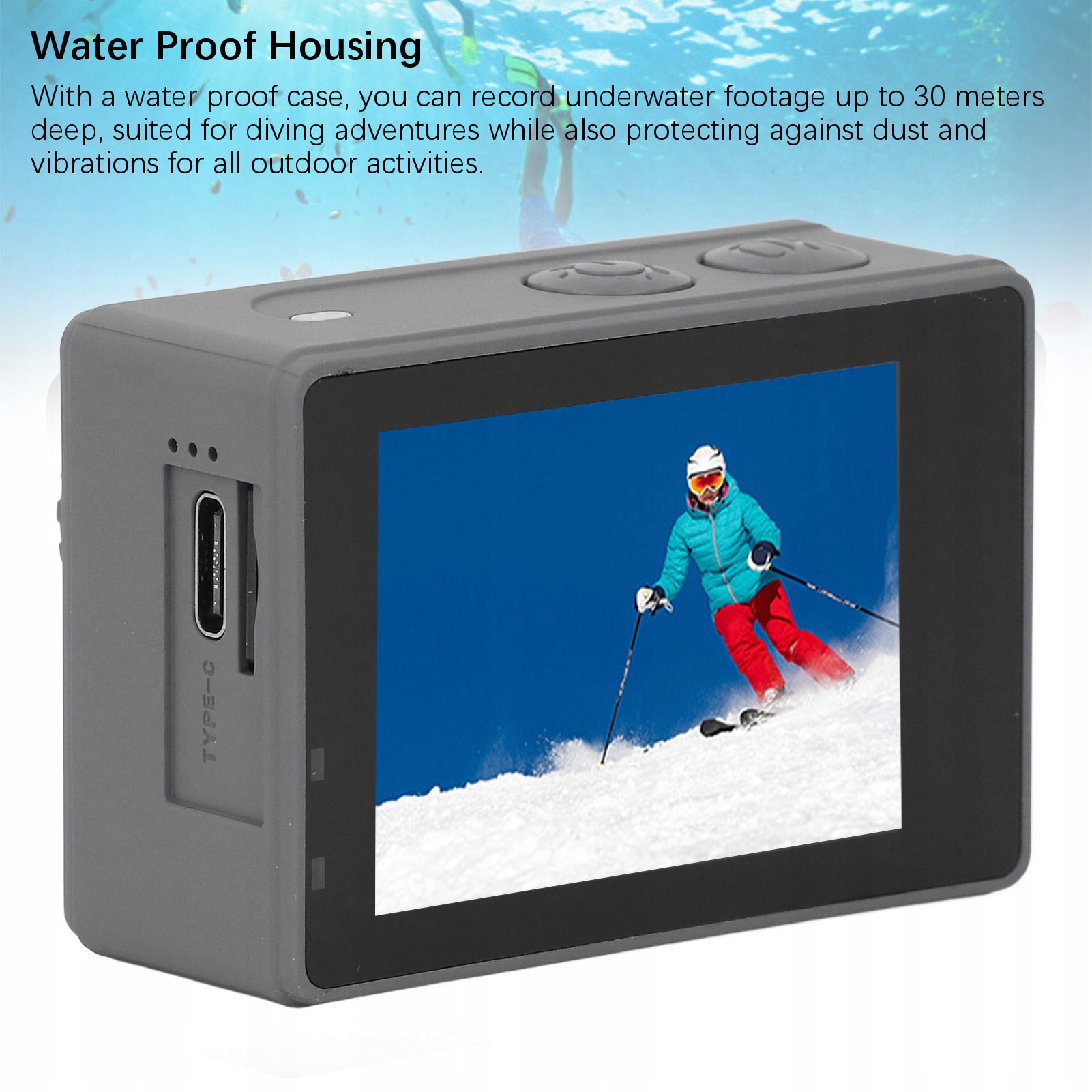 5. Корпус воды: С корпусом воды вы можете записать подводные материалы глубиной до 30 метров, адаптированные к приключению дайвинга, защищая от пыли и вибраций для всех занятий на свежем воздухе.