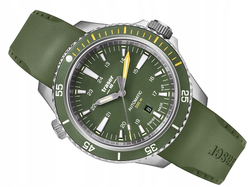 На зеленом щите есть дата на высоте 6:00, указывающая текущий день месяца. Весь содержит твердую зеленую резиновую полосу. Маскировать зеленые цвета чрезвычайно успешно отражают дух швейцарского бренда Traser, который много лет производит часы для армии.