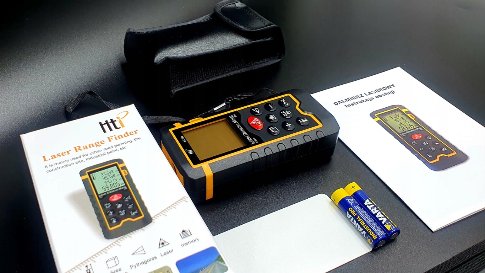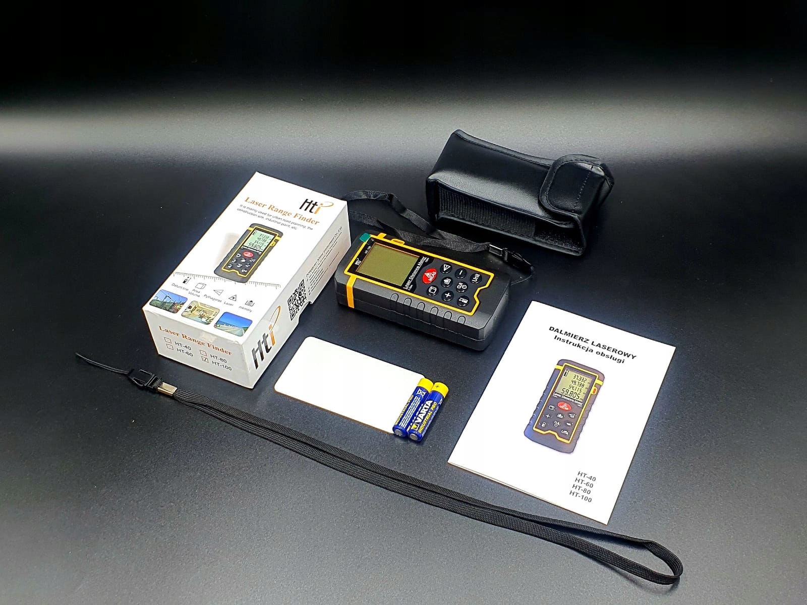 В комплект входит дальномер, коробка, чехол, держатель, инструкция на польском и английском языках.+ щелочные батарейки VARTA INDUSTRIALдля промышленного/профессионального использования.
