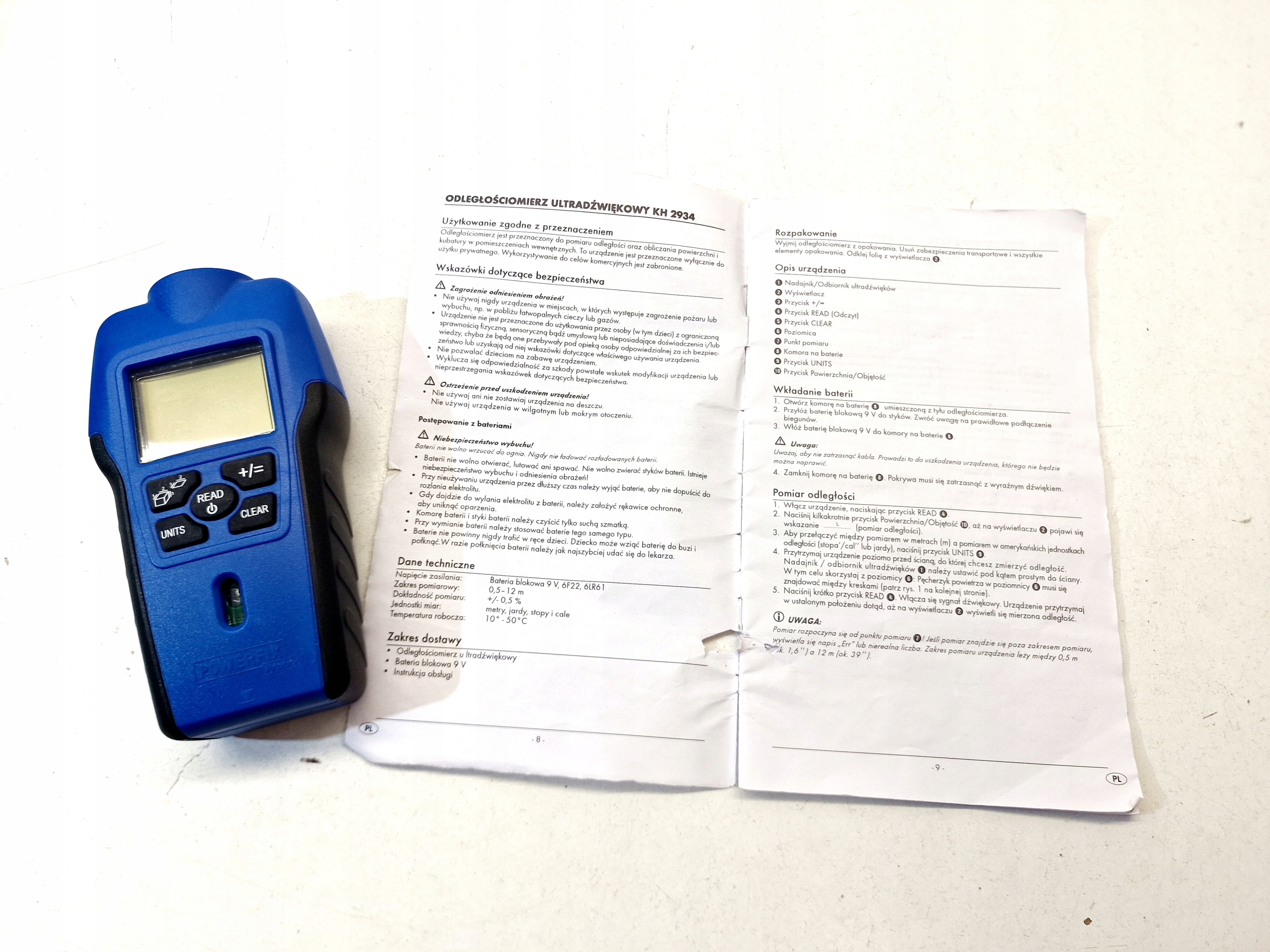 Ультразвуковой дальномер Powefix модели KH 2934. Устройство б/у и полностью работоспособно. Визуальное состояние очень хорошее. Питание от аккумулятора 9 В. В комплект входит инструкция по эксплуатации.
