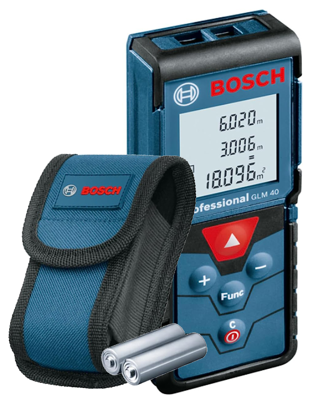 Дальномер BOSCH модели GLM 40 предназначен для быстрых, простых и, что самое главное, очень точных измерений с помощью лазерного луча. При нажатии кнопки он измеряет длину, площадь и объем, а результат измерения отображается на большом жидкокристаллическом дисплее дальномера.