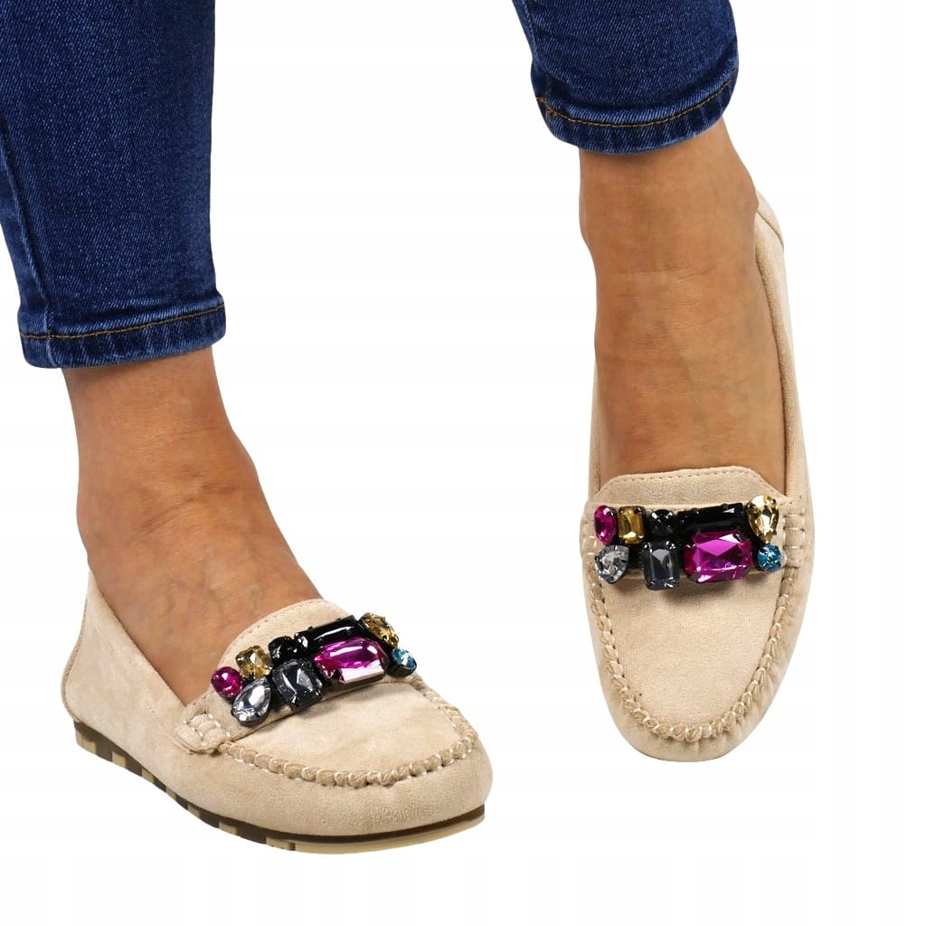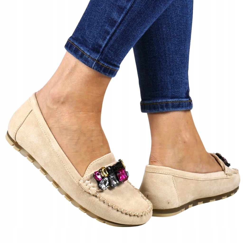 DAMSKIE MOKASYNY Z KAMIENIAMI PŁASKIE BEŻOWE ZAMSZOWE WYGODNE