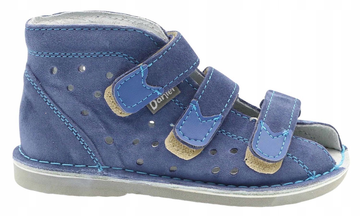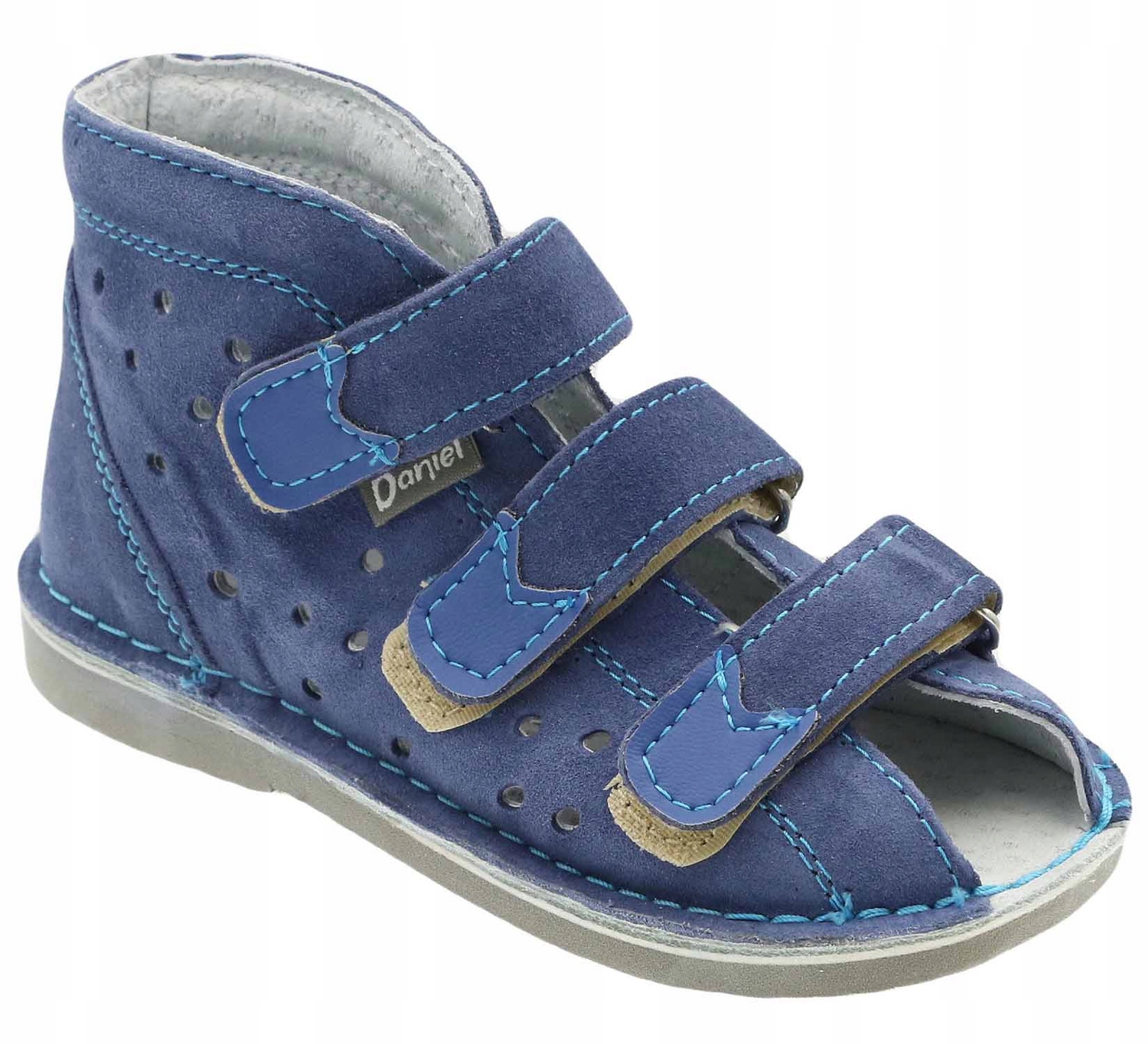 DANIEL Sklep Fabryczny - Профилактическая детская обувь из замши. Интерьер и профилированная внутренняя вставка отделаны натуральной кожей. Профилированная подошва с каблуком - Thomas - из гибкого и легкого материала - микроячеистого стирогума - прекрасно передает нагрузки на землю и поглощает удары. Микроразрезы в нижней части обеспечивают правильный сгибание и положение стопы. Поднятый, жесткий верх стабилизирует стопу и голеностопный сустав, а регулируемая застежка позволяет точно подогнать обувь под разную ширину. По конструкции, технологии и материалам обувь соответствует требованиям сертификата «Здоровая стопа», выданного IPS в Кракове и отмечена специалистами знаком «Желтая стопа» как идеальная в профилактике формирования правильного развития, функционирования и строения детской стопы.
