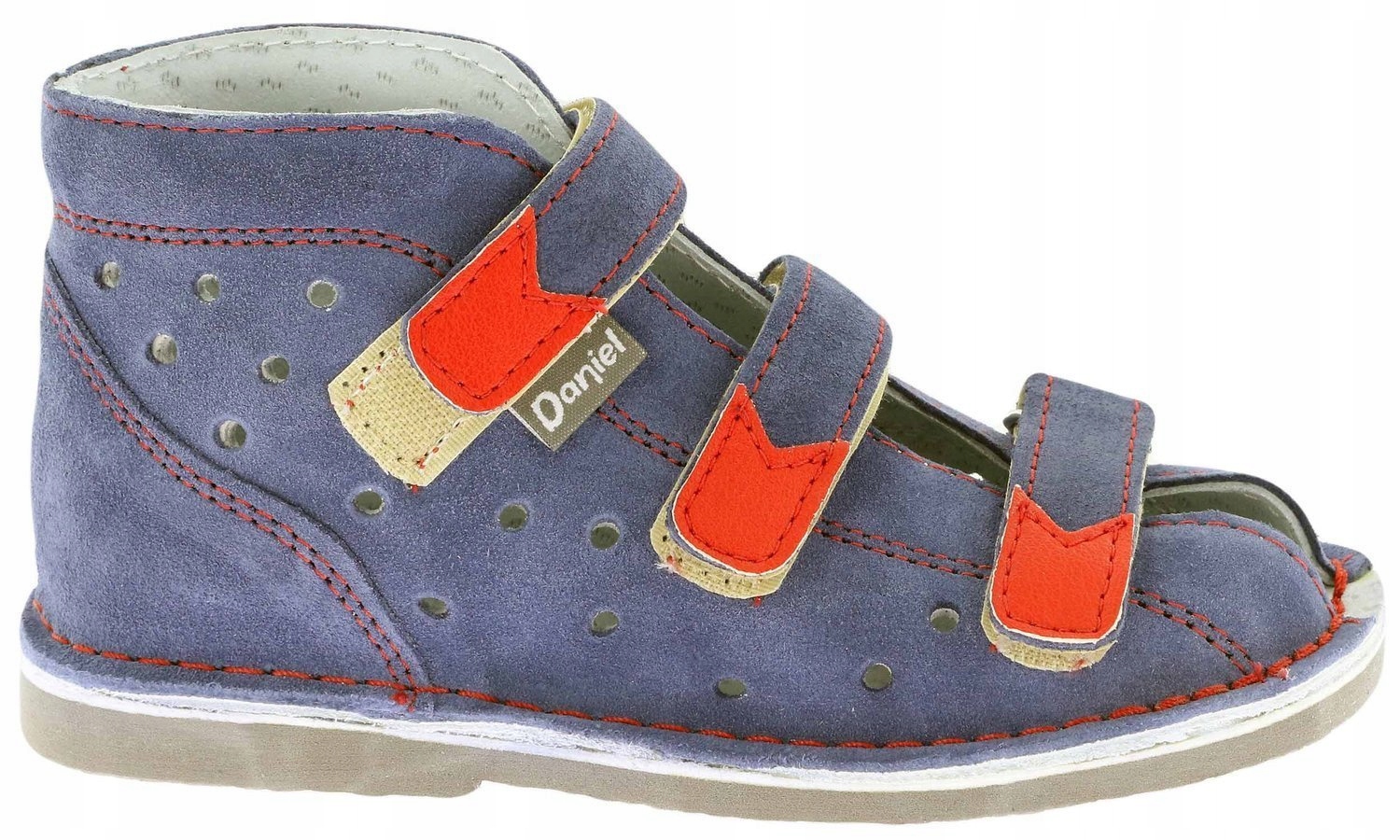 DANIEL Sklep Fabryczny - Профилактическая детская обувь из замши. Интерьер и профилированная внутренняя вставка отделаны натуральной кожей. Профилированная подошва с каблуком - Thomas - из гибкого и легкого материала - микроячеистого стирогума - прекрасно передает нагрузки на землю и поглощает удары. Микроразрезы в нижней части обеспечивают правильный сгибание и положение стопы. Поднятый, жесткий верх стабилизирует стопу и голеностопный сустав, а регулируемая застежка позволяет точно подогнать обувь под разную ширину. По конструкции, технологии и материалам обувь соответствует требованиям сертификата «Здоровая стопа», выданного IPS в Кракове и отмечена специалистами знаком «Желтая стопа» как идеальная в профилактике правильного развития, функционирования и строения детской стопы.