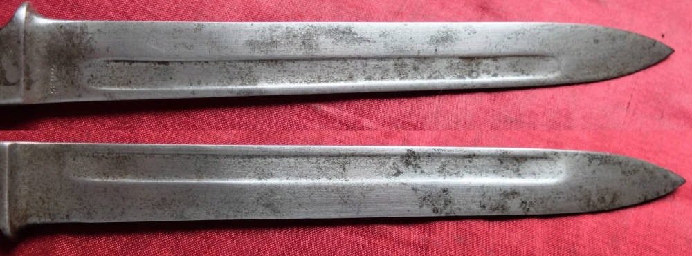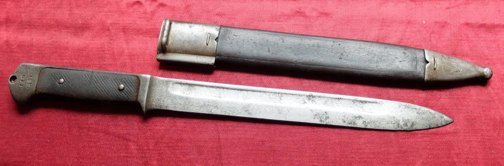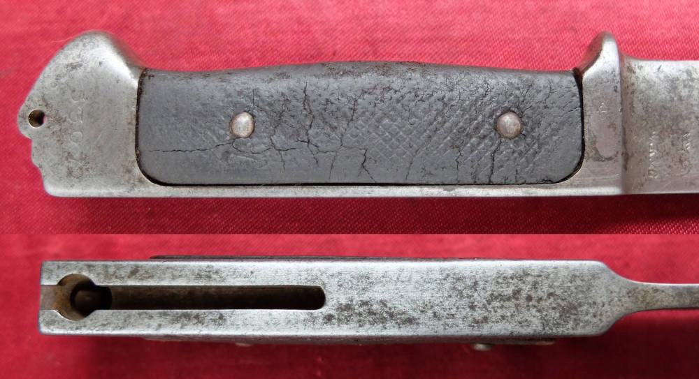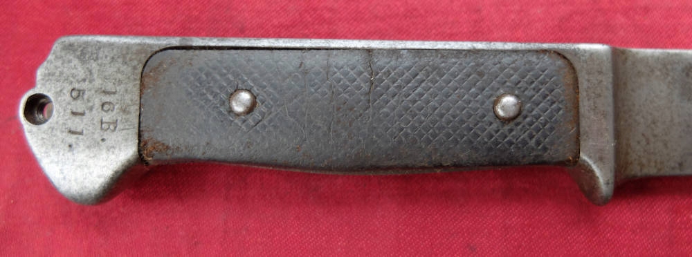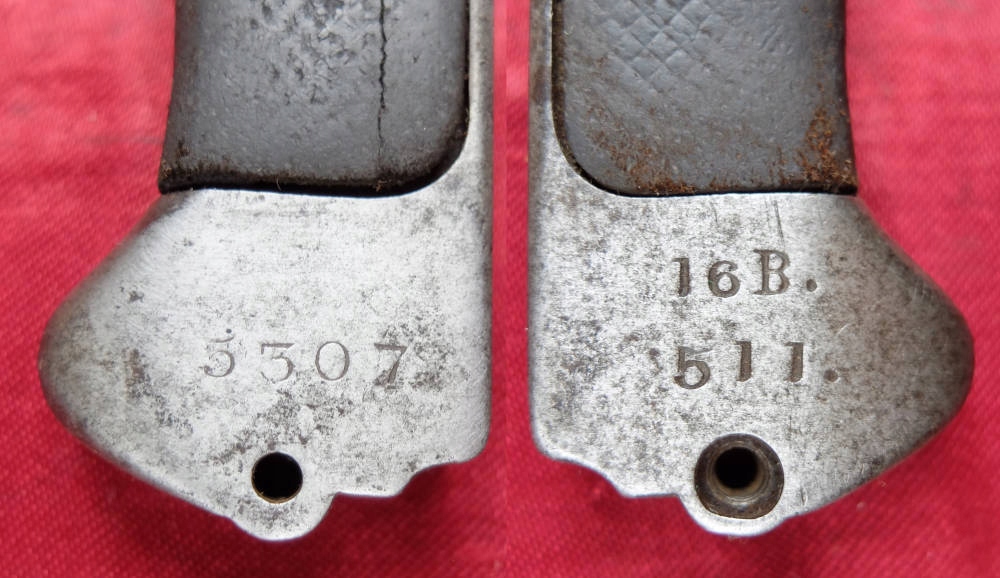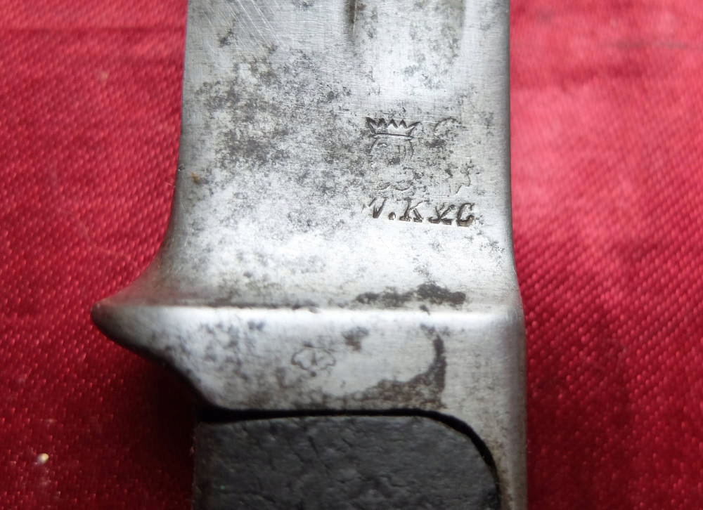 Предмет виден на фотографиях. Он хорошо сохранился. Лезвие не заточено, заточено в эпоху. На пороге клинка клеймо фабрики Weyersberg & Kirschbaum в Золингене - голова короля и рыцаря и буквы W.K.&Co (знак немного неразборчиво). На навершии нанесено полковое клеймо 16Б.511 (16-й батальон, номер оружия 511) и заводской номер винтовки 5307, к которой крепился штык. Накладки на ручки оригинальные, из закаленной кожи. Штык-замок отсутствует.