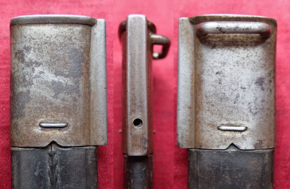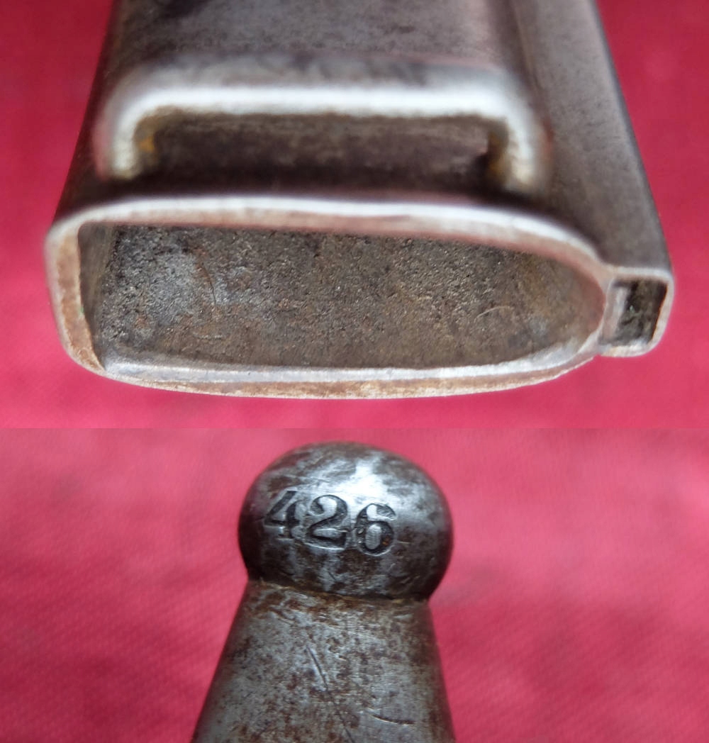 Ножны кожаные с металлической фурнитурой. Кожа очень хорошо сохранилась, без повреждений, без перегибов. Оригинальный шов сохранен. На шаре выбито число426. Лезвие хорошо помещается в ножнах. Штык-замок отсутствует.