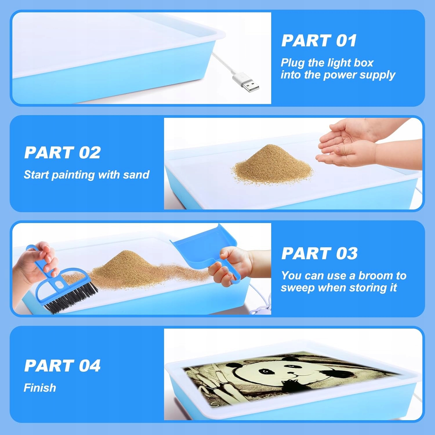 Набор для рисования песка: Наша игрушка для рисования песка для детей оснащена встроенной светодиодной панелью, которая обеспечивает деликатное и безопасное освещение, которое обеспечивает деликатное и безопасное освещение благодаря тому, что дети могут открыть для себя мир и повеселиться! Контраст между светом и тенью делает изображение на песке похожим на экрана телевизора.