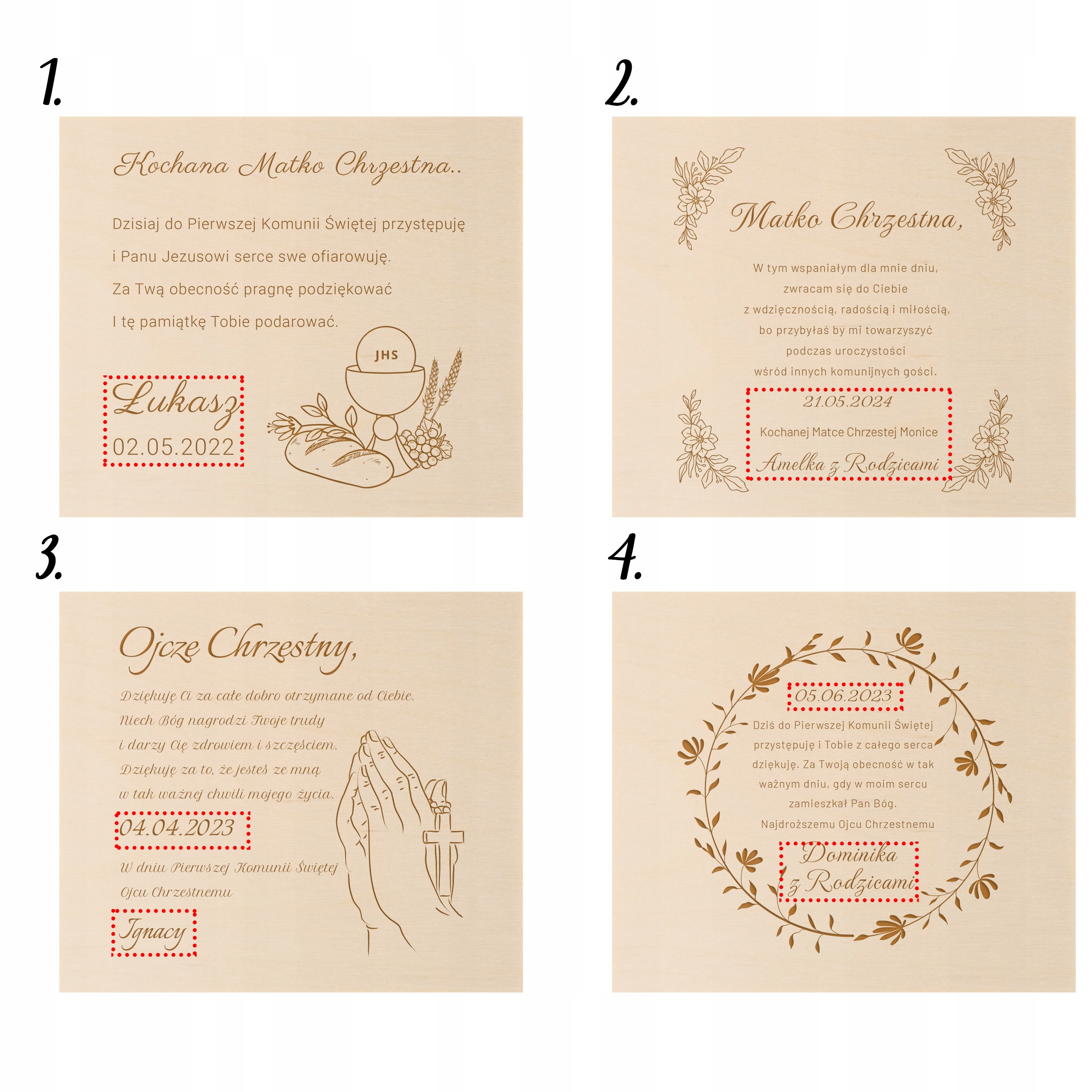 День причастия — прекрасная возможность поблагодарить крестных родителей. Для этого мы создали элегантные открытки с пожеланиями и красивой графикой внутри.