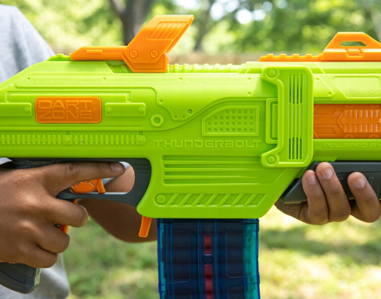 Dart Zone Thunderbolt Ultimate Dart обеспечивает быструю и полную мощность благодаря моторизованному приводу. Ваши выстрелы будут двигаться с высокой скоростью и иметь огромную дальность. У бластера есть возможность регулировать верхний прицел для достижения точности. Это идеальный выбор для людей, которые хотят настроить свои программы запуска. Стильный дизайн, благодаря светло-зеленому корпусу, выделит вас среди друзей. Система зарядки способствует быстрой и удобной подготовке к бою.