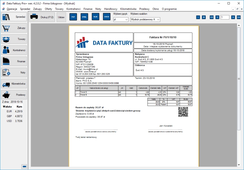 Data Invoices — простая и в то же время обширная программа для выставления счетов, которая благодаря своему дизайну позволит за несколько минут приступить к работе даже менее знакомому пользователю. Программа «Дата счета» ориентирована на малые и средние предприятия. Он дополнен возможностью работы на нескольких станциях в сети LAN, что позволяет работать на многих рабочих станциях за одну лицензию. Программа получает обновления в рамках приобретенной лицензии, которые мы выпускаем примерно с ежемесячной периодичностью, дополняя программу новыми функциями и действующими правилами на протяжении более 21 года.