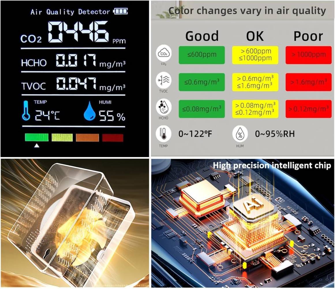 - ✨Интеллектуальный тестер содержания углекислого газа 5 в 1: использует воздушные полупроводниковые датчики для контроля качества воздуха со стабильной производительностью и высокой точностью. Может использоваться для обнаружения углекислого газа, летучих органических соединений, температуры и влажности.