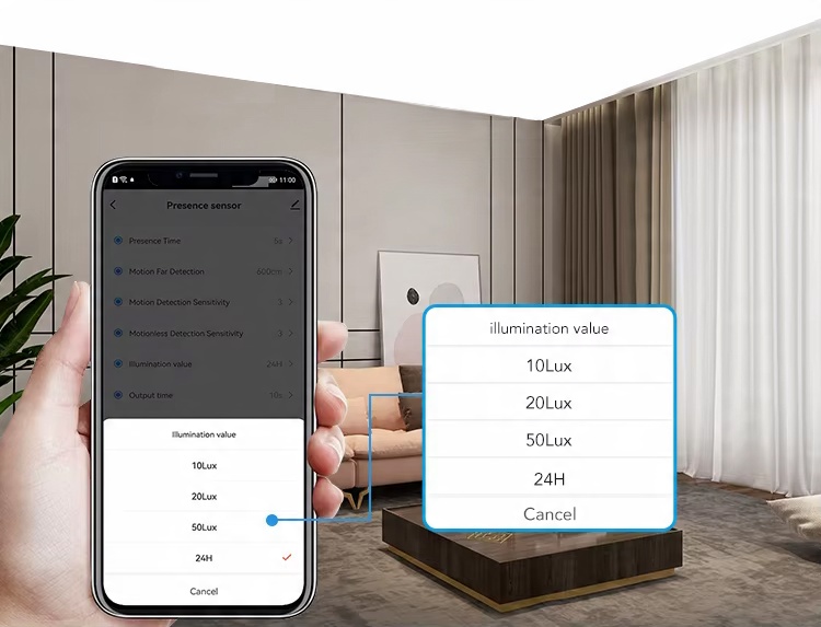 - Вы также можете настроить датчик, чтобы он регулировался только на низких уровнях освещения (10/20/50lux) или независимо от освещения