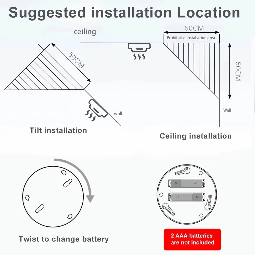 ✅ 【Установка Flat's】 Лучшее место для установки датчика дыма - это центр потолка. Потому что дым, тепло и легковоспламеняющиеся материалы, которые поднимаются до потолка, распространяются вбок. Пожалуйста, держите не менее 30 см от света или других украшений.