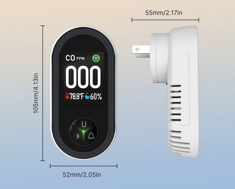 - Прозрачный цифровой дисплей с интуитивно понятными кнопками для переключения температурных единиц, вращения экрана и регулировки яркости. Компактная конструкция заглушки для легкой установки в стенке, а также вентиляционные отверстия и индикаторы, обеспечивающие надежное обнаружение и предупреждение, что.