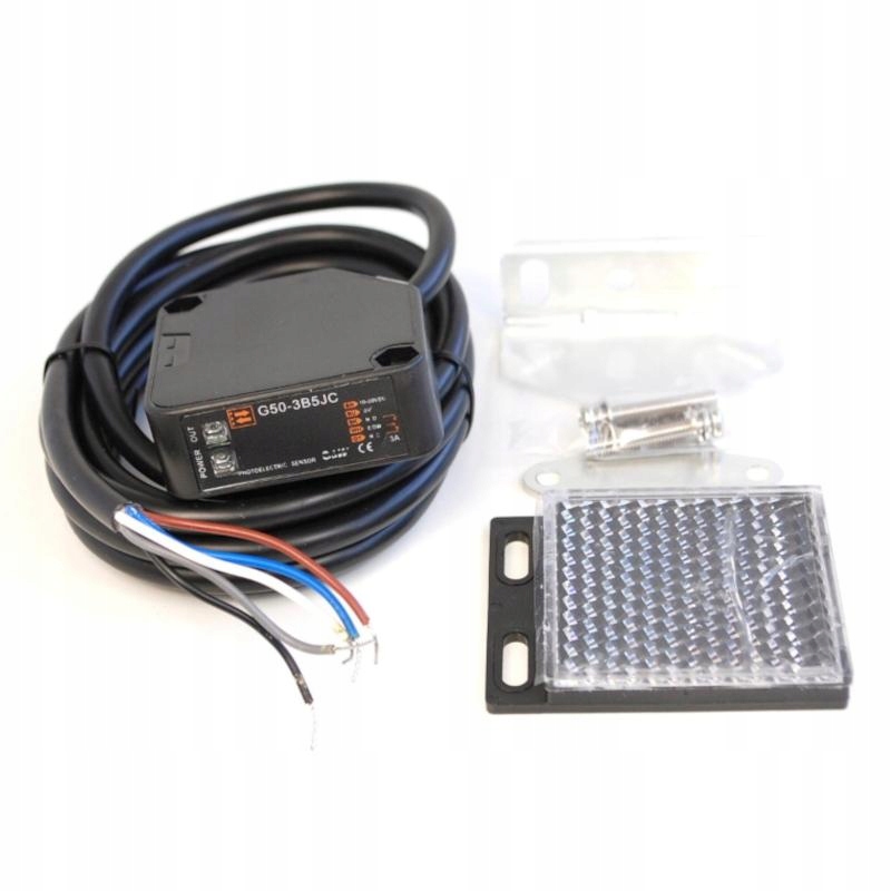 Фотоэлектрический датчик G50-3B5JC. Он обнаруживает присутствие объекта, когда он пересекает луч света, отраженный от зеркала. Максимальная дальность действия — 500 см.