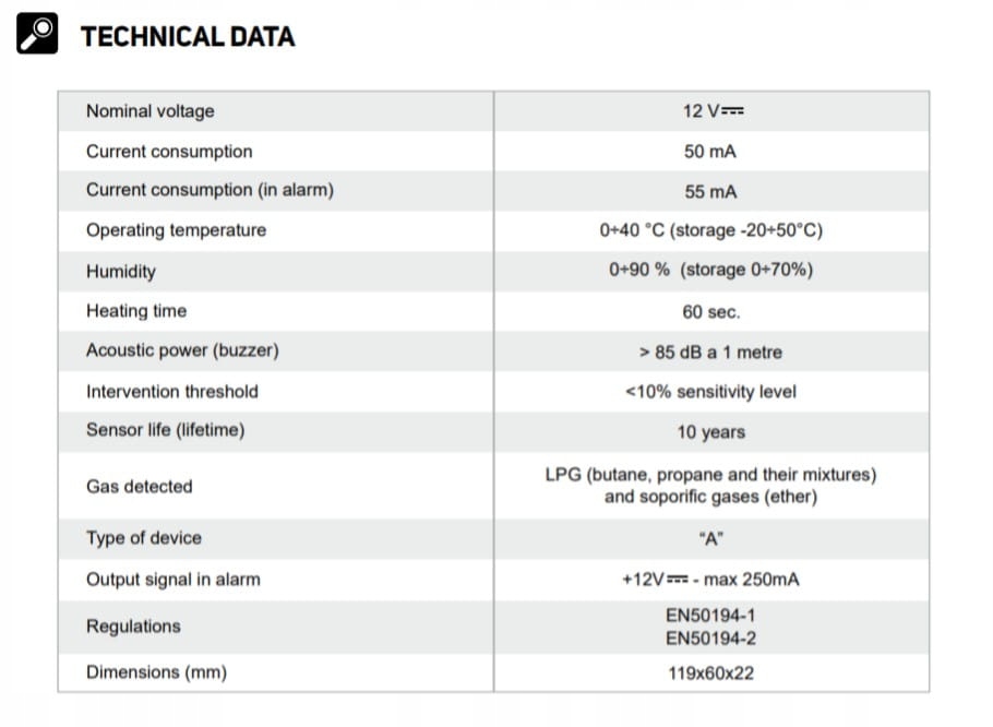 Визуальный и звуковой сигнал предупреждает о наличии газа в воздухе до того, как его концентрация достигнет одной десятой минимального значения, необходимого для возникновения взрыва (СНГ) или до того, как он повлияет на людей (сонный газ).