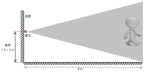 Рекомендуемая высота настенного монтажа радарного модуля HLK-LD2420 составляет от 1,5 до 2 м. При настенном монтаже ось X радарного модуля равна. направлены в горизонтальном направлении, ось Y направлена вверх, а ось Z указывает на зону обнаружения.