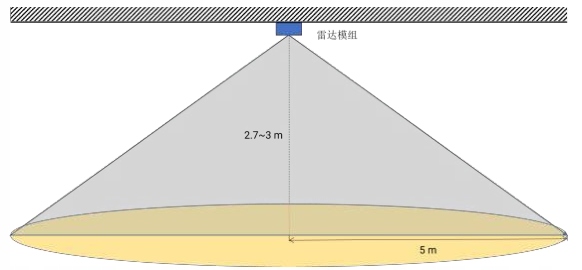 Рекомендуемая высота монтажа радарного модуля HLK-LD2420 на потолке составляет от 2,7 м до 3 м. В конфигурации по умолчанию максимальная дальность обнаружения движения этого устройства. Модуль представляет собой коническое трехмерное пространство. Этот модуль идеально подходит для мониторинга движения внутри помещений, обеспечивая широкий диапазон обнаружений, сохраняя при этом точные и стабильные результаты.