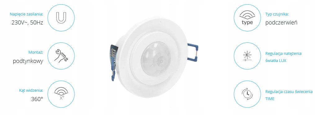 Датчик предназначен для установки в подвесные потолки и используется для управления освещением или другими электрическими устройствами. Механическая регулировка положения датчика, потенциометры для регулировки: времени освещения и чувствительности силы света. Датчик работает со светодиодной подсветкой.