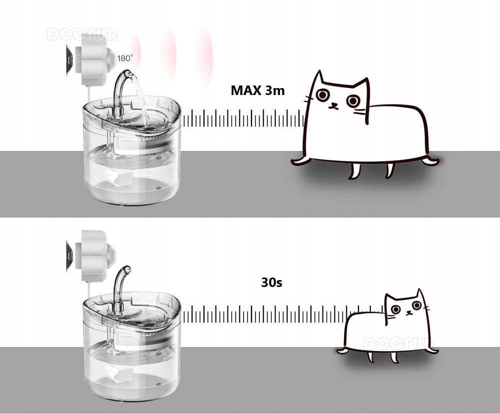 Когда питомец утолит жажду и покинет зону действия датчика, поилка выключится и перейдет в спящий режим через 30 секунд.