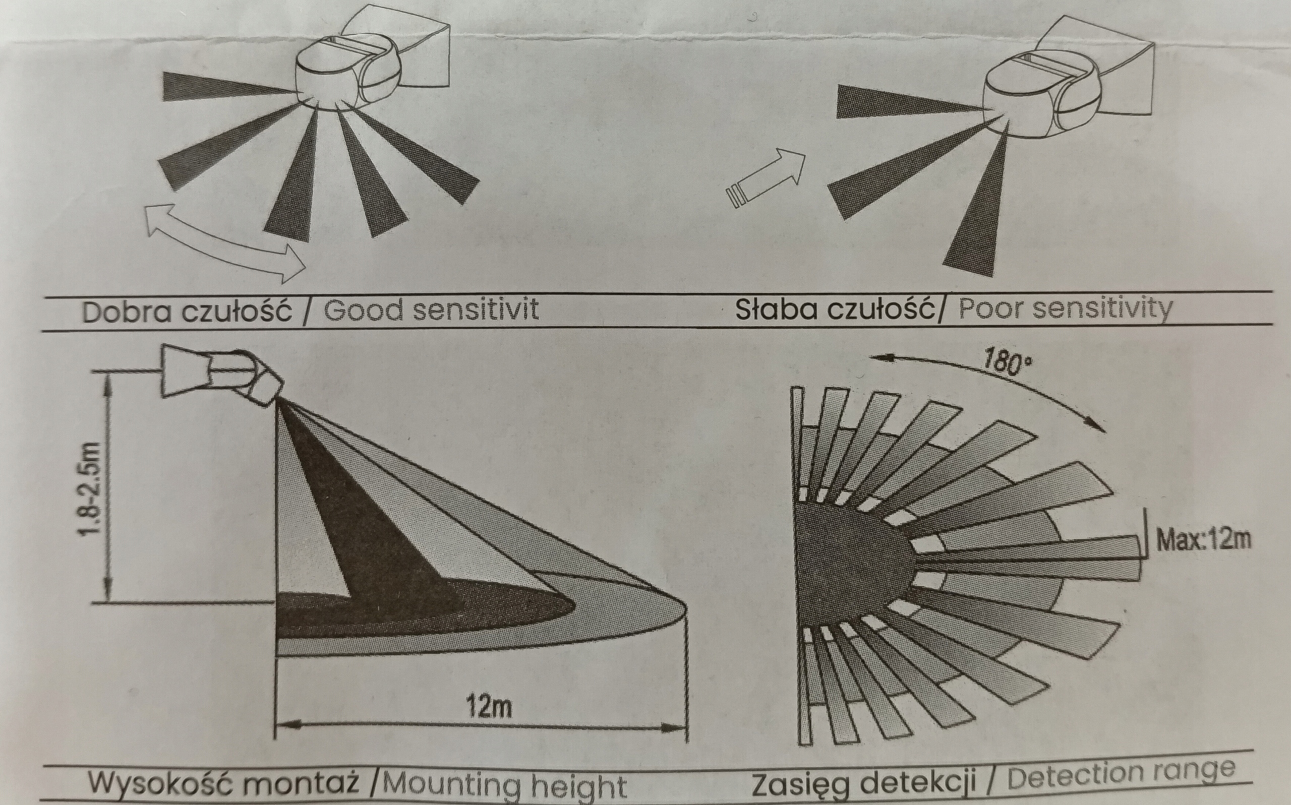 Принимая во внимание параметр относительно высоты (h). Датчик на заданной чувствительности в максимальной положении позволяет обнаружить движение в области до 12 м. Объем чувствительности может быть дополнительно уменьшен в настройках приложения.