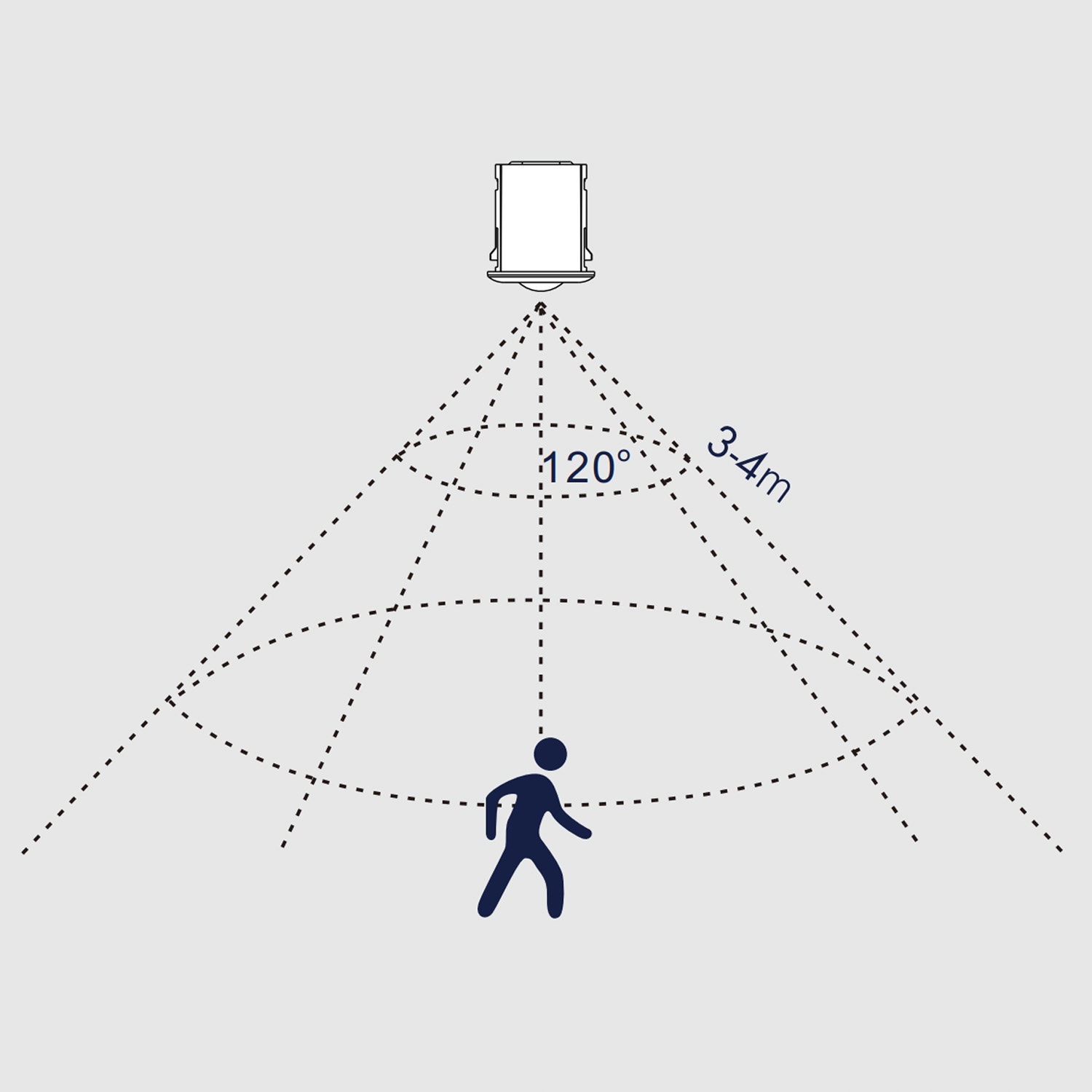 Устройство работает в диапазоне ~ 3,5 метра с распылением 120 ° . Свет включится автоматически, когда движение будет обнаружено в определенном диапазоне. После выхода из поле зрения свет автоматически отключается в течение 30 секунд .