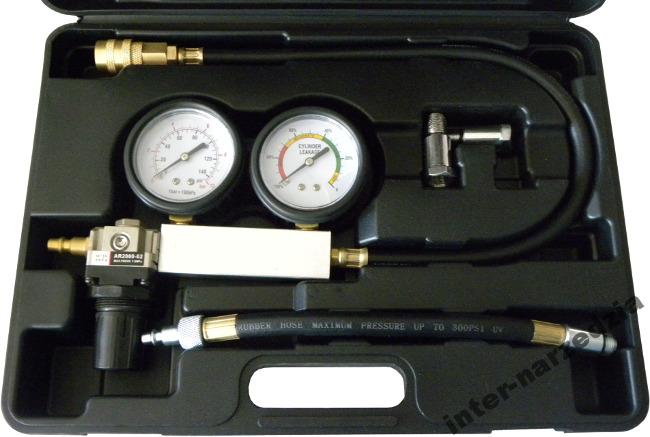 Этот комплект отлично определит утечки в баллонах, имеет два детектора для измерения давления и для измерения потери давления в процентах. Уникальным преимуществом является возможность обнаружения места утечки. Тестер выявляет: повреждение поршневых колец, повреждение впускного или выпускного клапана, повреждение прокладки ГБЦ.