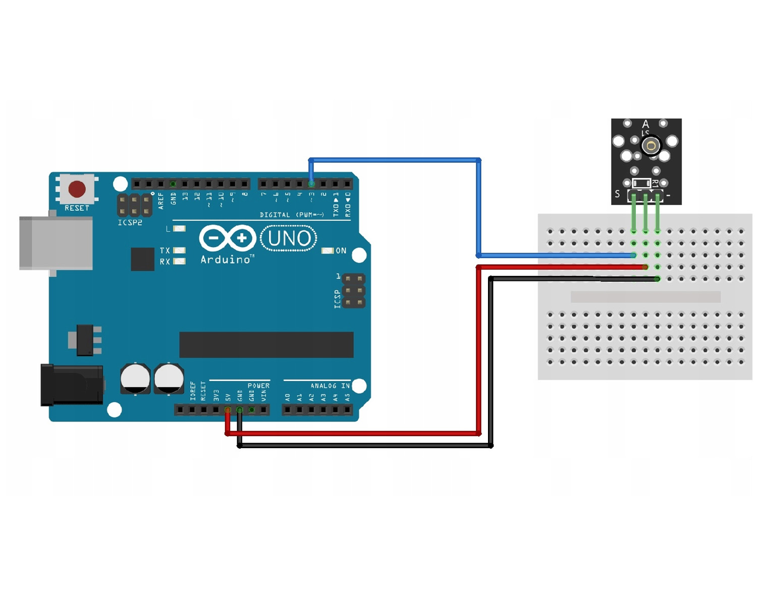 Подключите линию питания модуля VDD (средний) к Arduino +5V. Земля (GND) к земле Ardiuno. Подключите третий контакт (сигнальный) к входу DIGITAL INPUT 2/3.