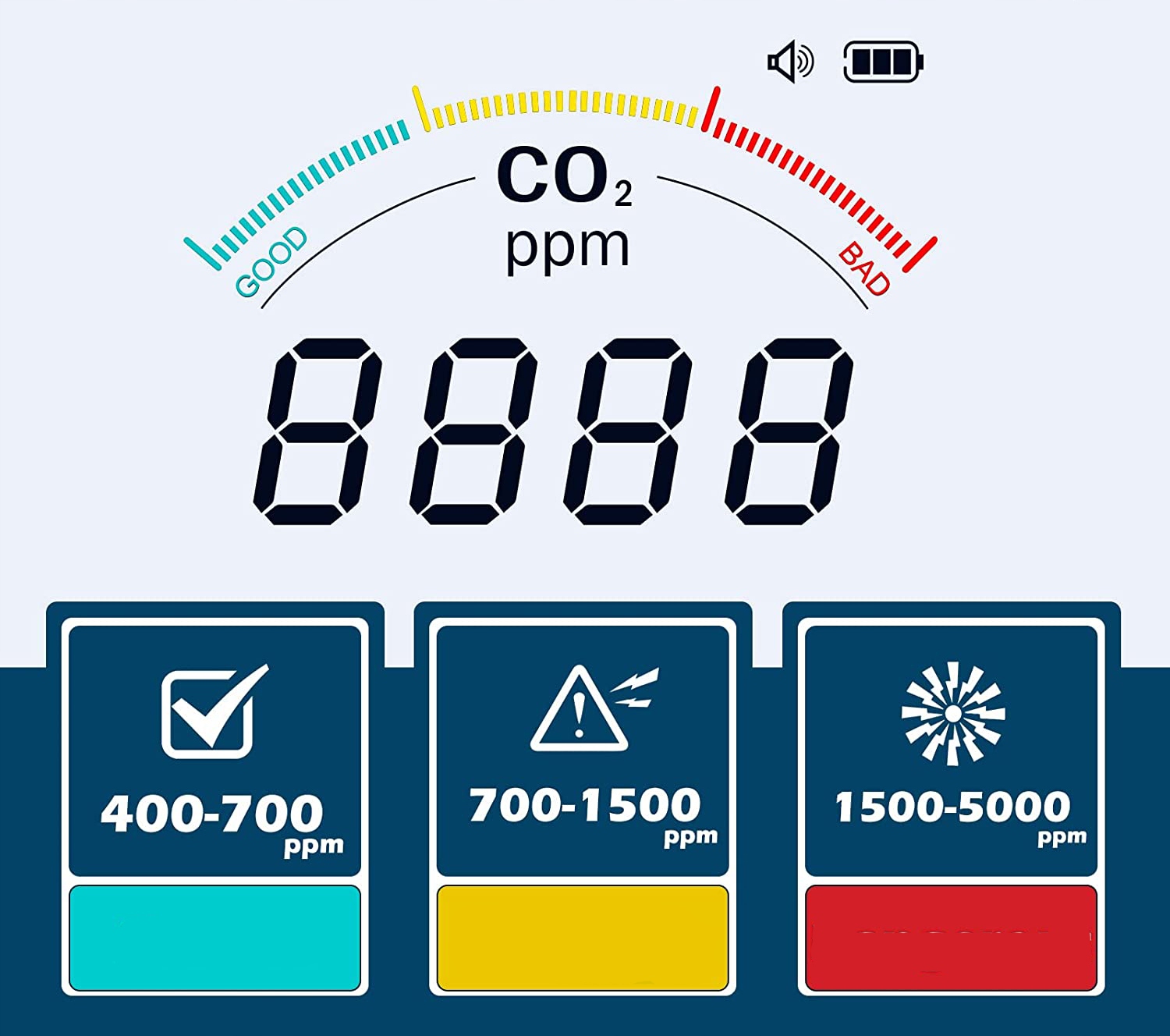 Каждый раз, когда показания углекислого газа превышают установленный порог, а следующее показание превышает предыдущее, счетчик издает звуковой сигнал, информирующий о повышении.