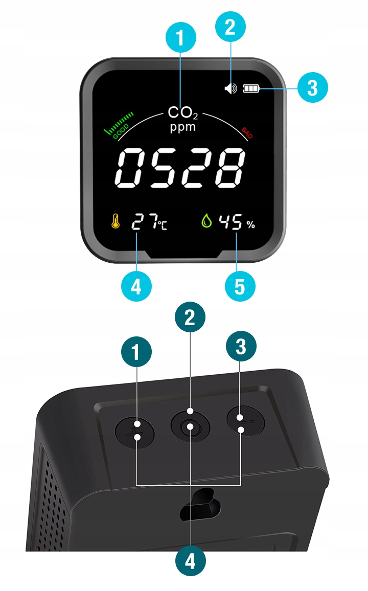 ⚪ Функция звукового оповещения при превышении заданного значения CO2 (возможность установить порог 400-5000, каждые 1 единицу)