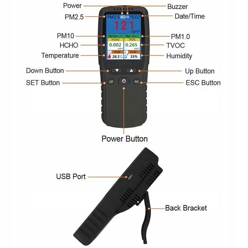 высококачественный лазерный датчик является заводским калиброванием одним из наиболее точных измерительных устройств. Верно и быстрое измерение позволяет вам идентифицировать с высокой точностью очень незначительной загрязняющей пыли воздуха и угрожая наше здоровье, то есть PM1, PM2.5, PM10.