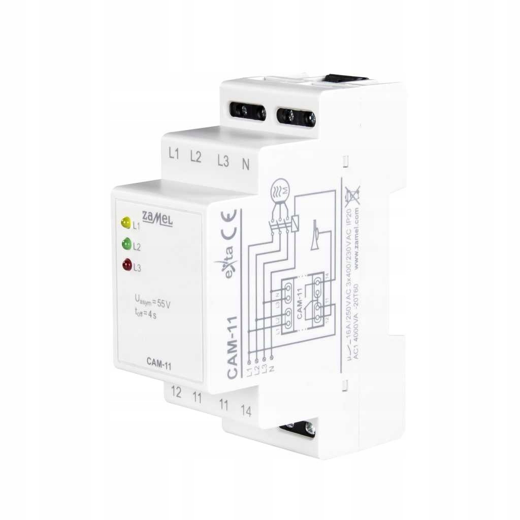Cam-11 используется для защиты устройств, включенных в трехфазной сети (например, двигателей) от повреждения, в случае исчезновения фазового напряжения или асимметрии натяжения фазы. Значение порога асимметрии установлено на 55 В. Устройство питается из любой фазы, что означает, что наличие напряжения на одной фазе достаточно, чтобы сделать его полностью функциональным. Задержка исключения и гистерезиса напряжения приводит к тому, что датчик устойчив к краткосрочным колебаниям напряжения