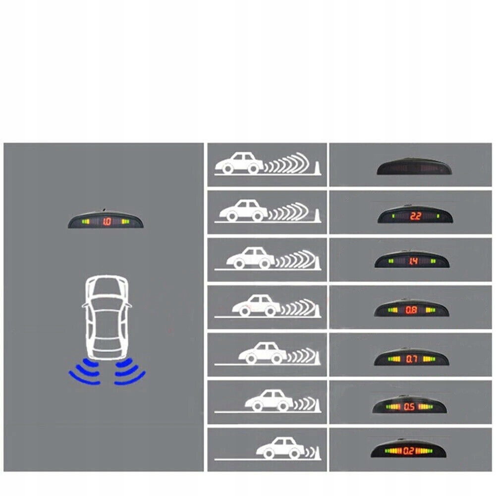 ※ Цифровой светодиодный дисплей с 3 цветами (красный, желтый и зеленый), указывающий различные диапазоны расстояний для наблюдения за автомобилем сзади и препятствиями. ※ ※ Простота установки