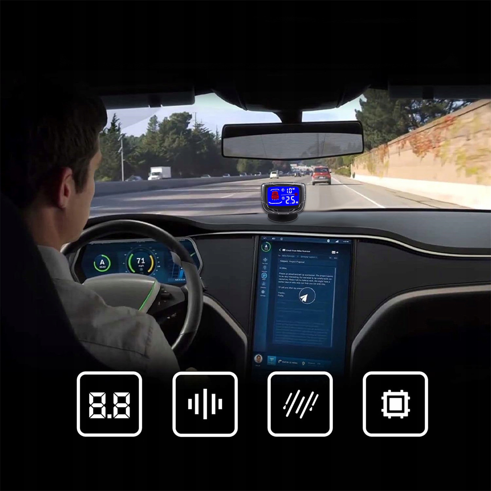 2,5-дюймовый цифровой ЖК-дисплей показывает расстояние до препятствий, что позволяет точно определить расстояние. парковка.